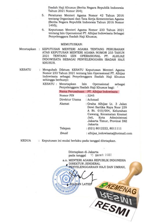 Alhijaz telah mengantongi berbagai izin resmi dari Pemerintah RI. Hal ini merupakan bukti nyata keseriusan kami dalam memberikan layanan terbaik untuk para calon Tamu Allah SWT.